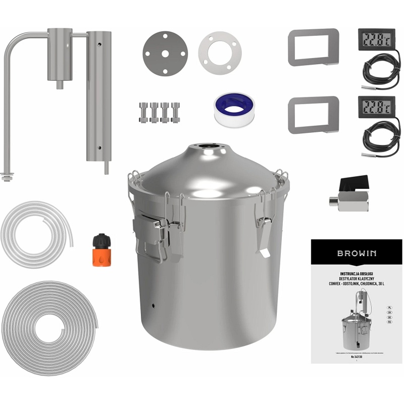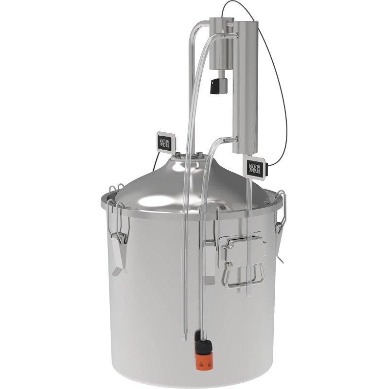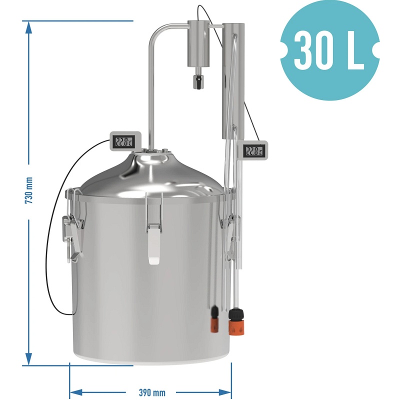 Destilačný prístroj je vybavený 30-litrovou nádobou (s odporúčanou úrovňou naplnenia do 90 % objemu a nie menej ako 25 %) a kondenzátorom s 1 číriacim zariadením a 2 teplomermi, čo umožňuje vykonávať destiláciu bez akéhokoľvek ďalšieho vybavenia. Táto súprava je vhodná na použitie s rôznymi zdrojmi tepla. Dva presné teplomery so sondami uľahčujú reguláciu teploty – vo vnútri nádoby a v číriaci zariadení. Plastifikovaná PVC hadica so spojkou umožňuje rýchle pripojenie prívodu a odtoku vody. Silikónová hadica sa používa na zber destilátu.
