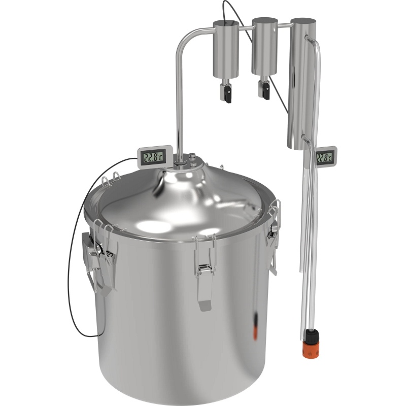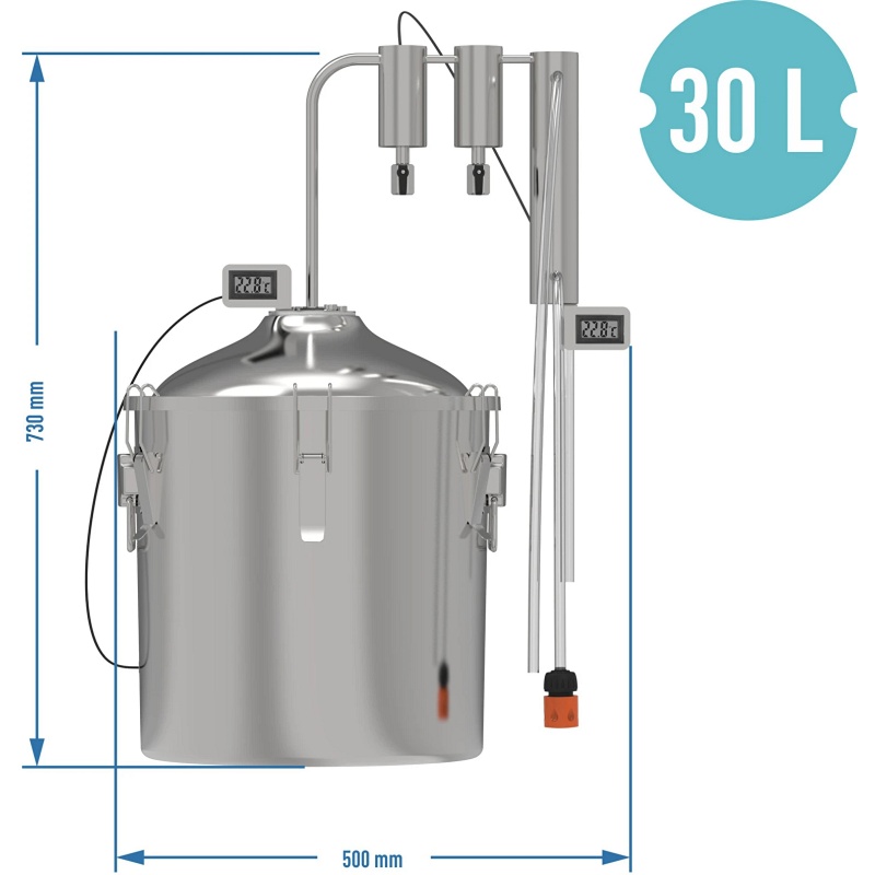 Destilačný prístroj je vybavený 30-litrovou nádobou (s odporúčanou úrovňou naplnenia do 90 % objemu a nie menej ako 25 %) a kondenzátorom s 2 číriacimi nádobami a 2 teplomermi, čo umožňuje destiláciu bez akéhokoľvek ďalšieho vybavenia. Táto súprava je vhodná na použitie s rôznymi zdrojmi tepla. Dva presné teplomery so sondami uľahčujú reguláciu teploty – vo vnútri nádoby a v číriacej nádobe. Plastifikovaná PVC hadica so spojkou umožňuje rýchle pripojenie prívodu a odtoku vody. Silikónová hadica sa používa na zber destilátu.