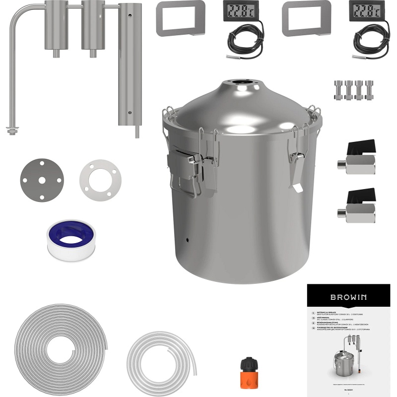 Nádoba a veko sú plne kompatibilné s destilačnými modulmi dostupnými od spoločnosti BROWIN – keď máte tento destilačný prístroj, môžete ho vylepšiť komponentmi, ako sú konektory, refluxy, kontrolné okienka, kondenzátory alebo dokonca bočné prijímače.
