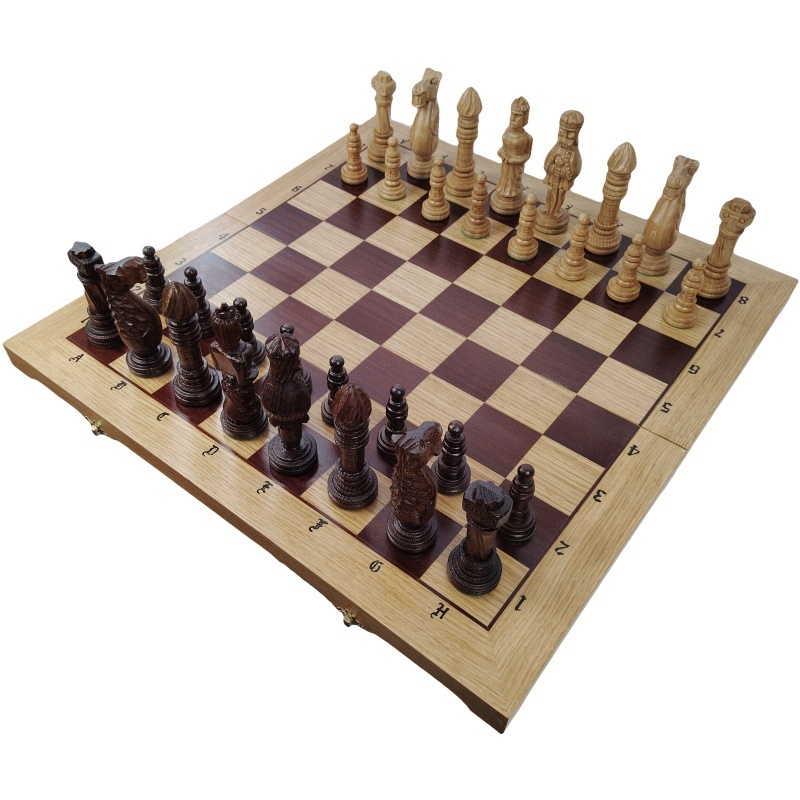 Tieto veľkorysé drevené šachy s rozmerom 64 x 64 cm predstavujú dokonalú kombináciu klasickej elegancie, remeselného spracovania a funkčného dizajnu. Hracia doska je vyrobená z kvalitného tvrdého dubového dreva, na ktorom krásne vyniká kontrast svetlých a tmavých polí. Figúrky sú ručne vyrezávané s dôrazom na detail a majú historizujúci vzhľad, vďaka čomu pôsobia ako umelecké miniatúry. Tento set je nielen hernou pomôckou, ale aj hodnotným dekoratívnym prvkom.