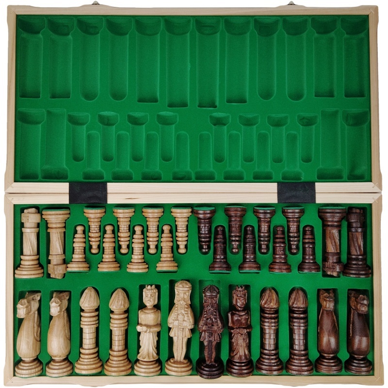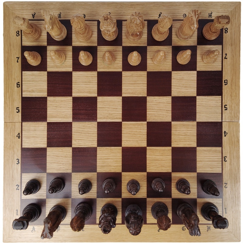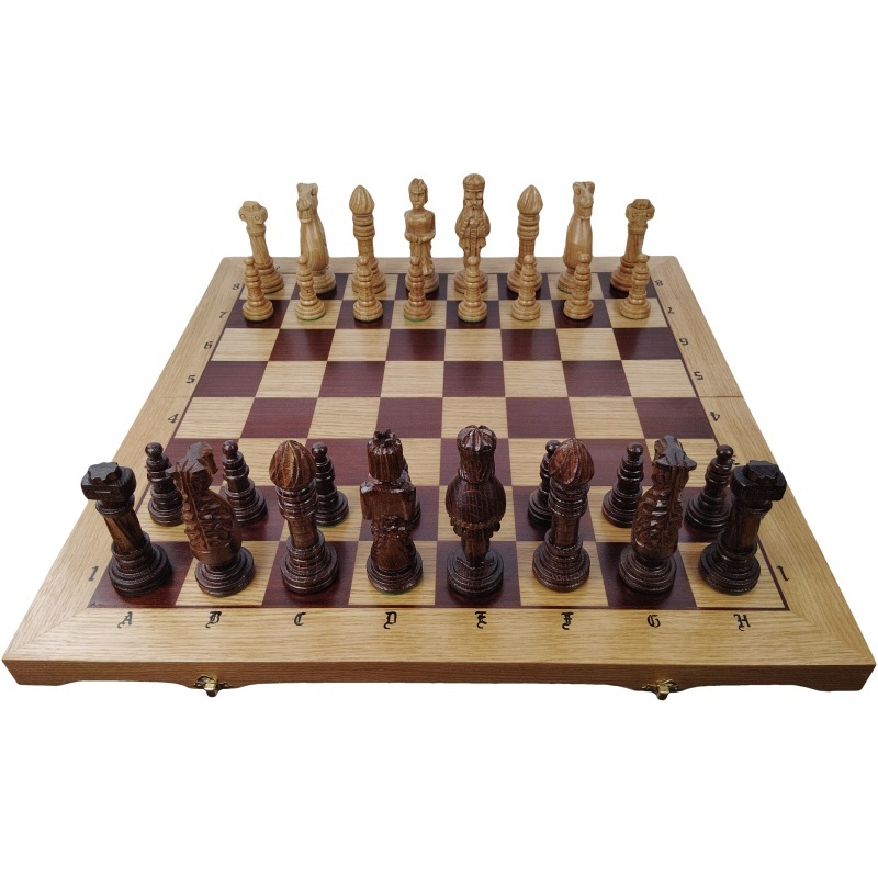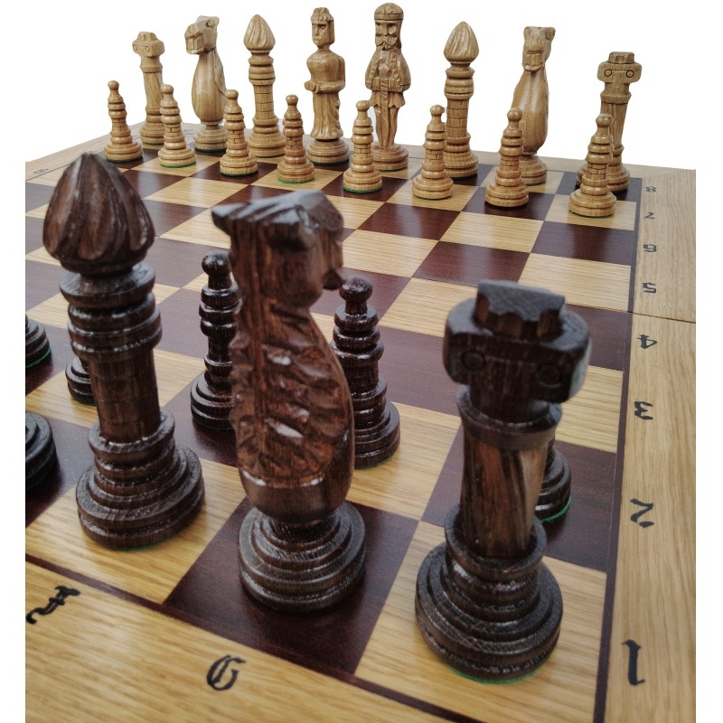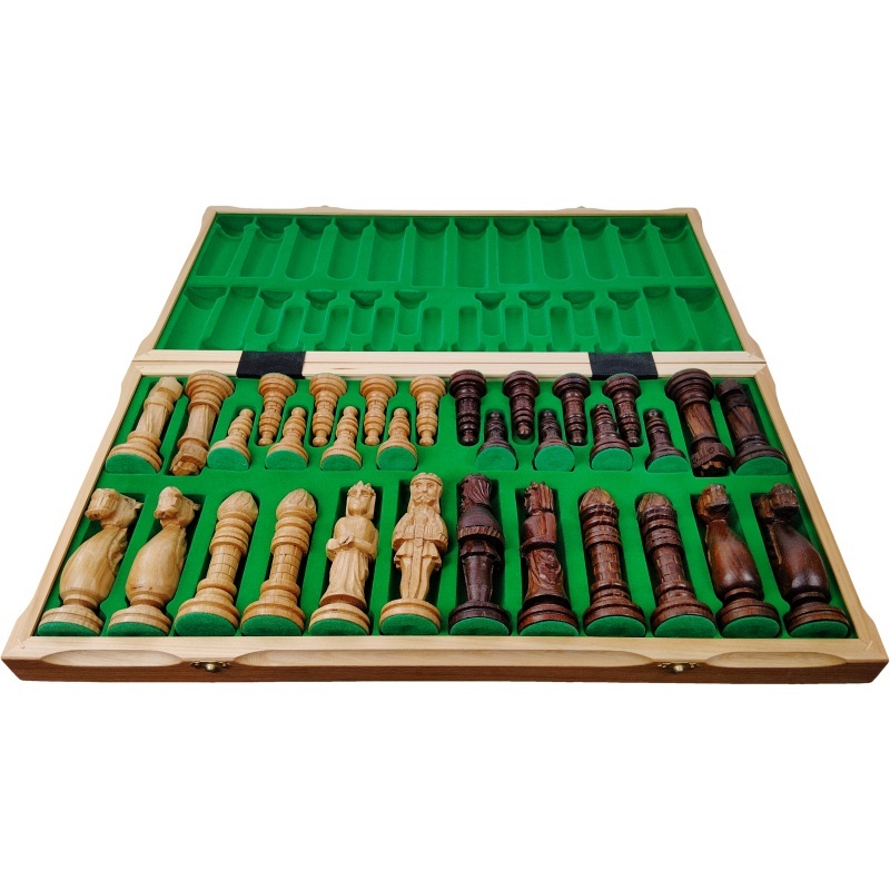 Remeselné spracovanie s dôrazom na detail – Každá figúrka je ručne vyrezávaná zo samostatného kusu dreva, s unikátnymi črtami a osobitým charakterom. Šachovnica je pevná, starostlivo opracovaná a vyniká precíznym vyhotovením rohov, rámovania i označení polí.