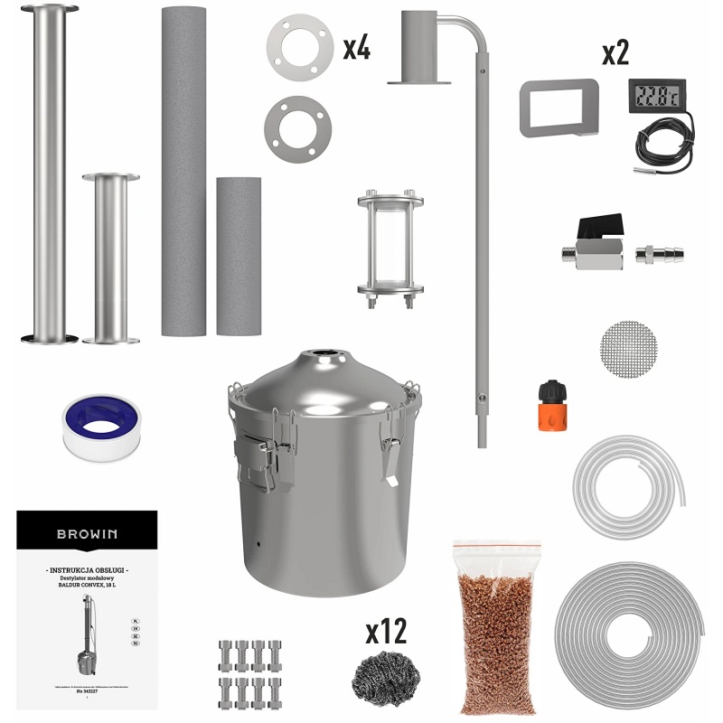 Baldur - symbol dobra a krásy, obľúbenec všetkých bohov, najkrajší a najušľachtilejší medzi Ásmi. Vďaka tejto sade majú získané destiláty veľmi dobrú chuť a krásnu arómu. Konvexný modulárny destilačný prístroj Baldur je nová verzia s nádobou s kupolovitým vekom a prepracovaným umiestnením odčítavania teploty nádoby a odľahčením kolóny.
